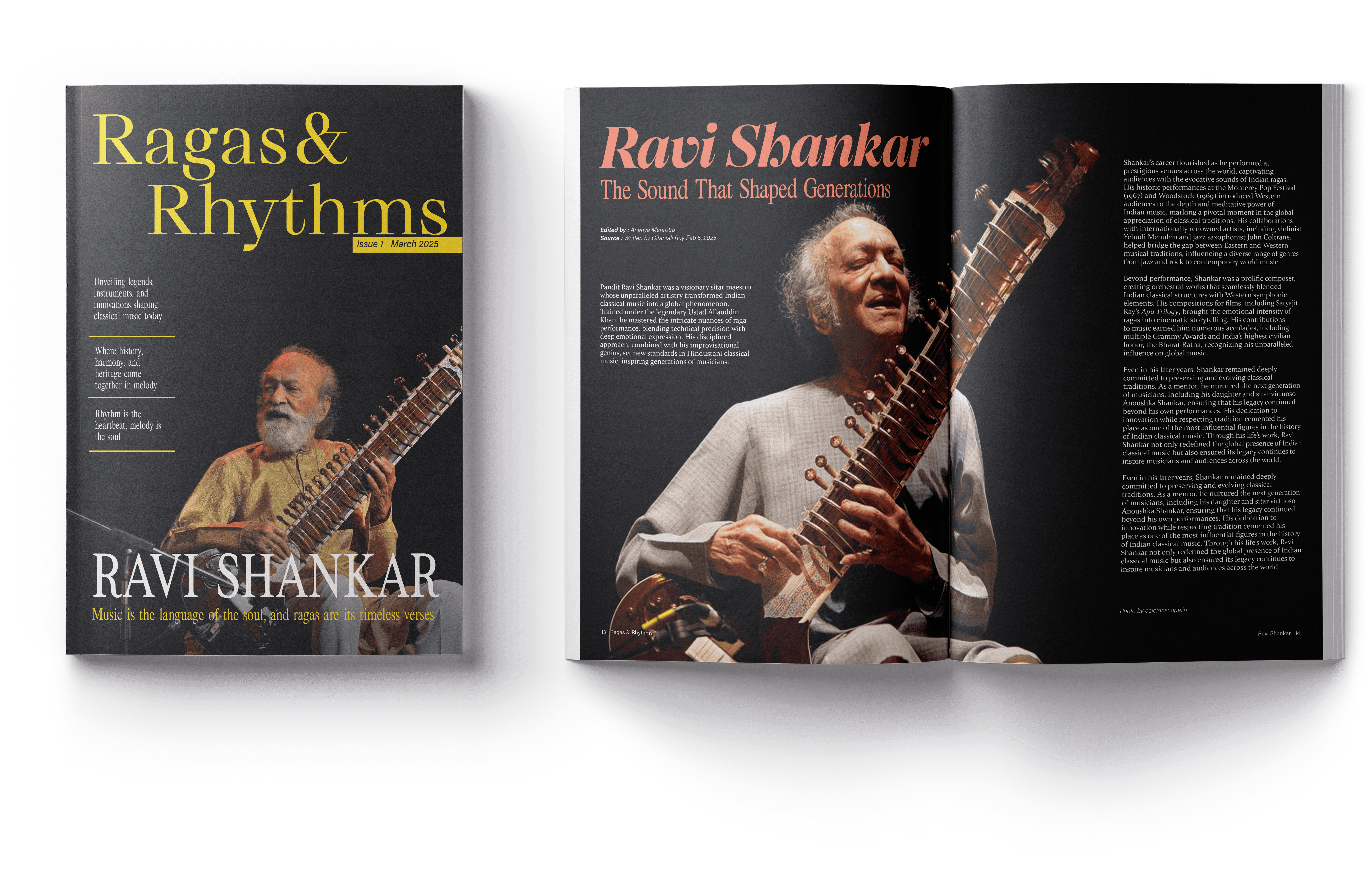Ragas and Rhythms: The Soul of Indian Classical Music is a magazine that explores the depth, history, and evolving legacy of Indian classical music. Blending tradition with contemporary perspectives, it celebrates ragas, talas, legendary maestros, and new-age artists, inviting both connoisseurs and curious listeners into this timeless musical journey.